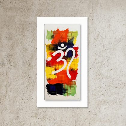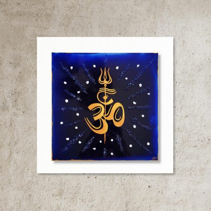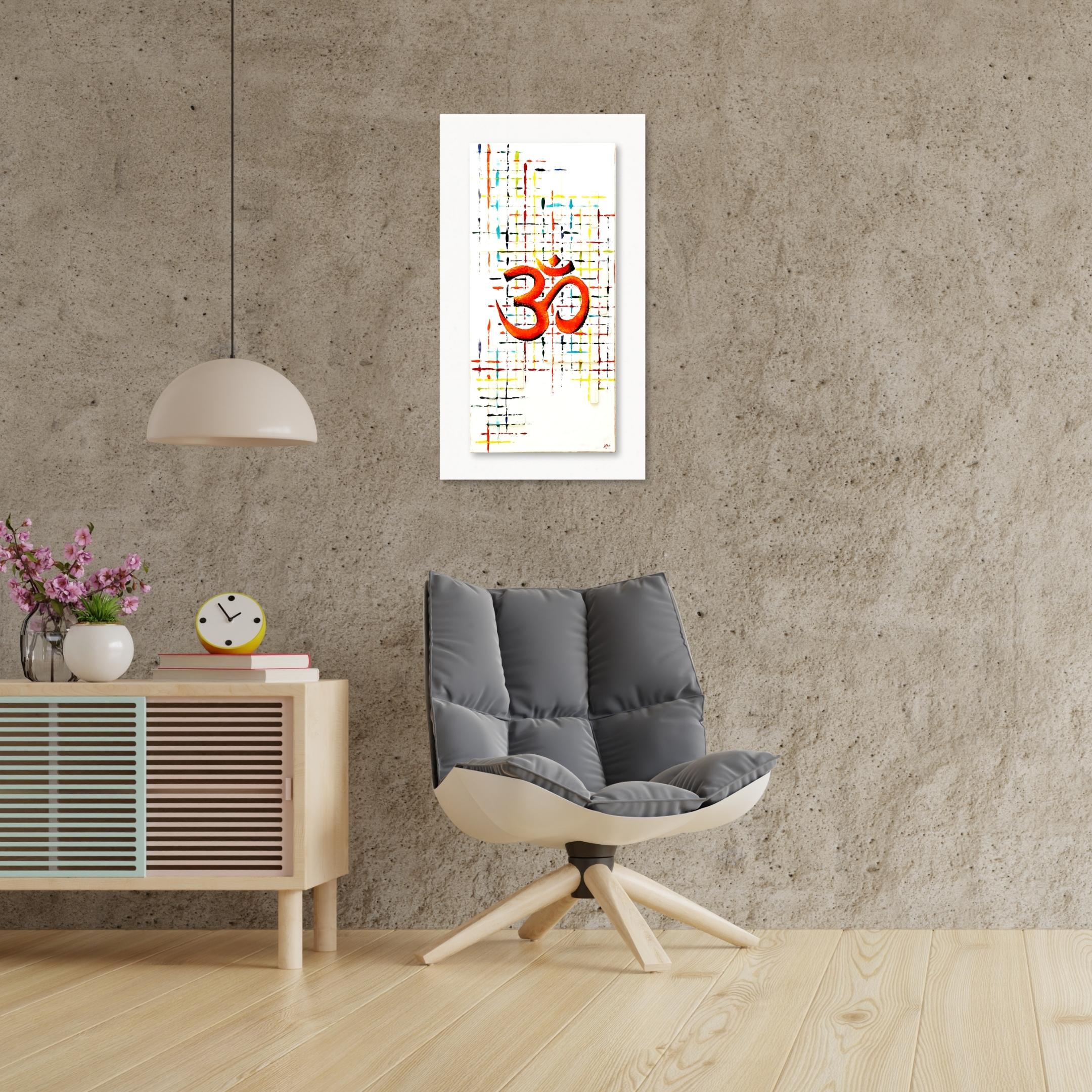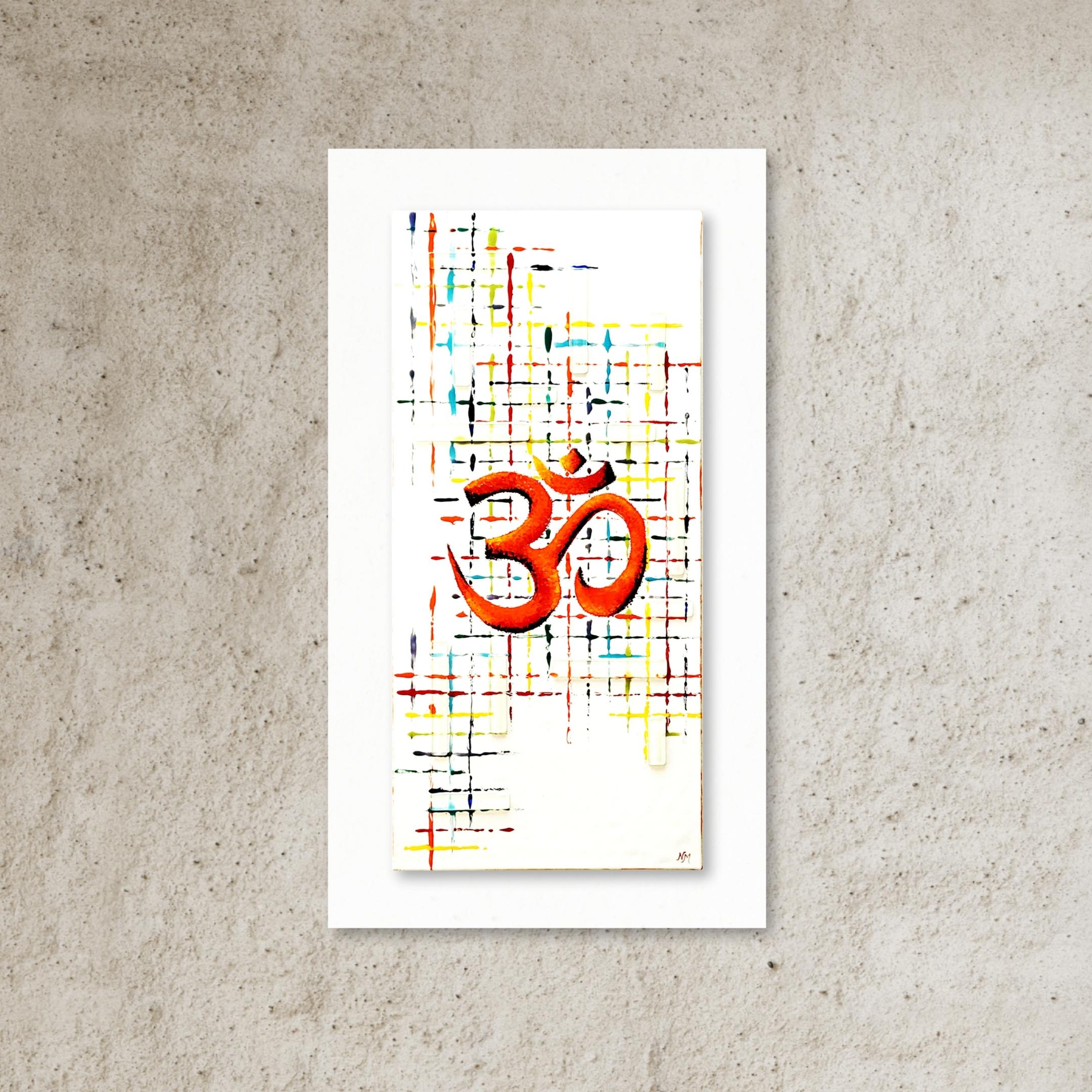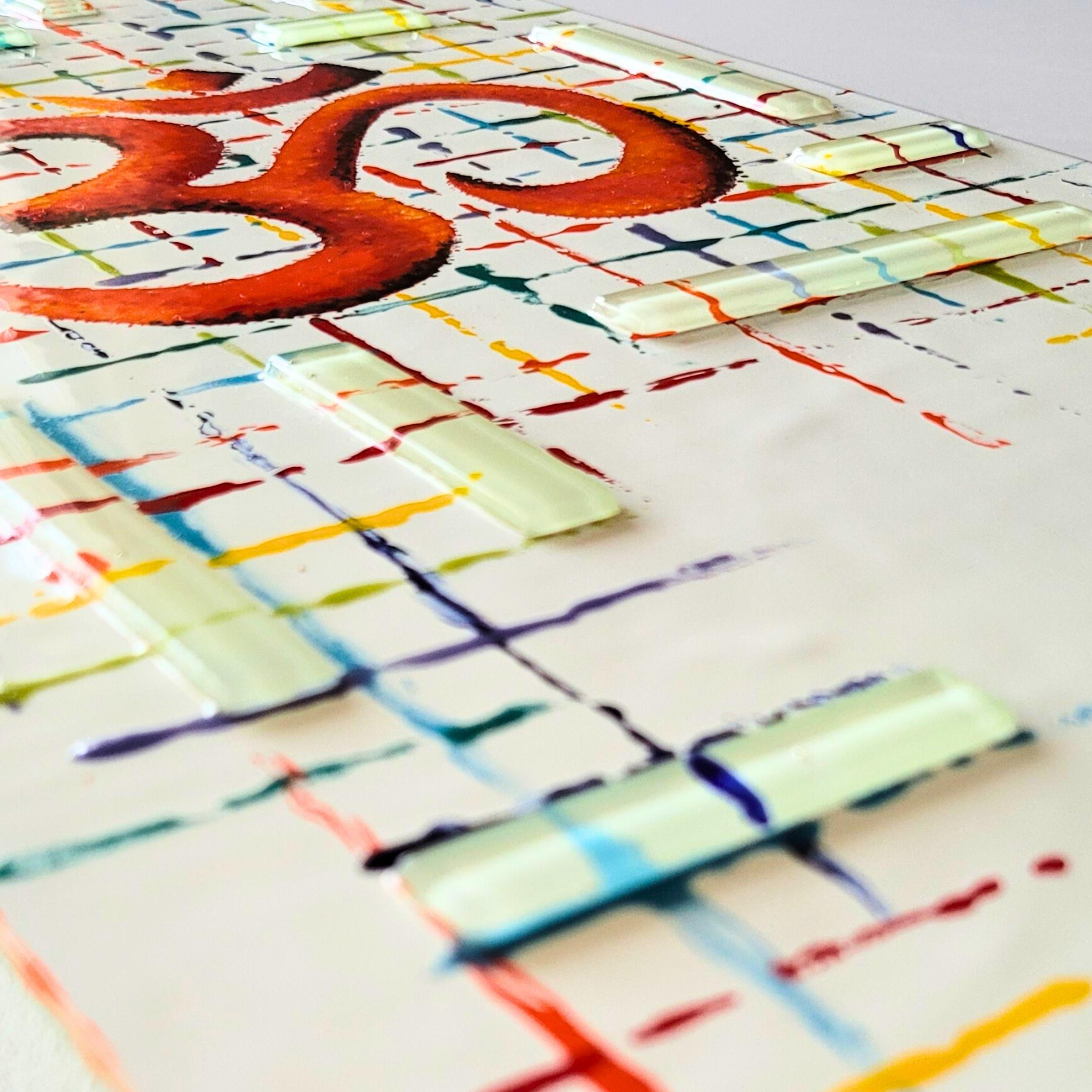 Burnt orange Aum with a black shadow. Background comprises of a colourful grid and clear glass strip detail.