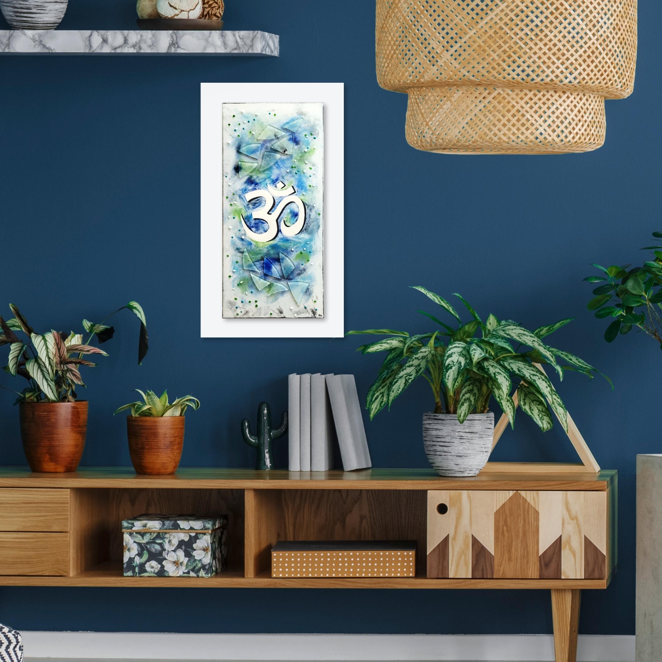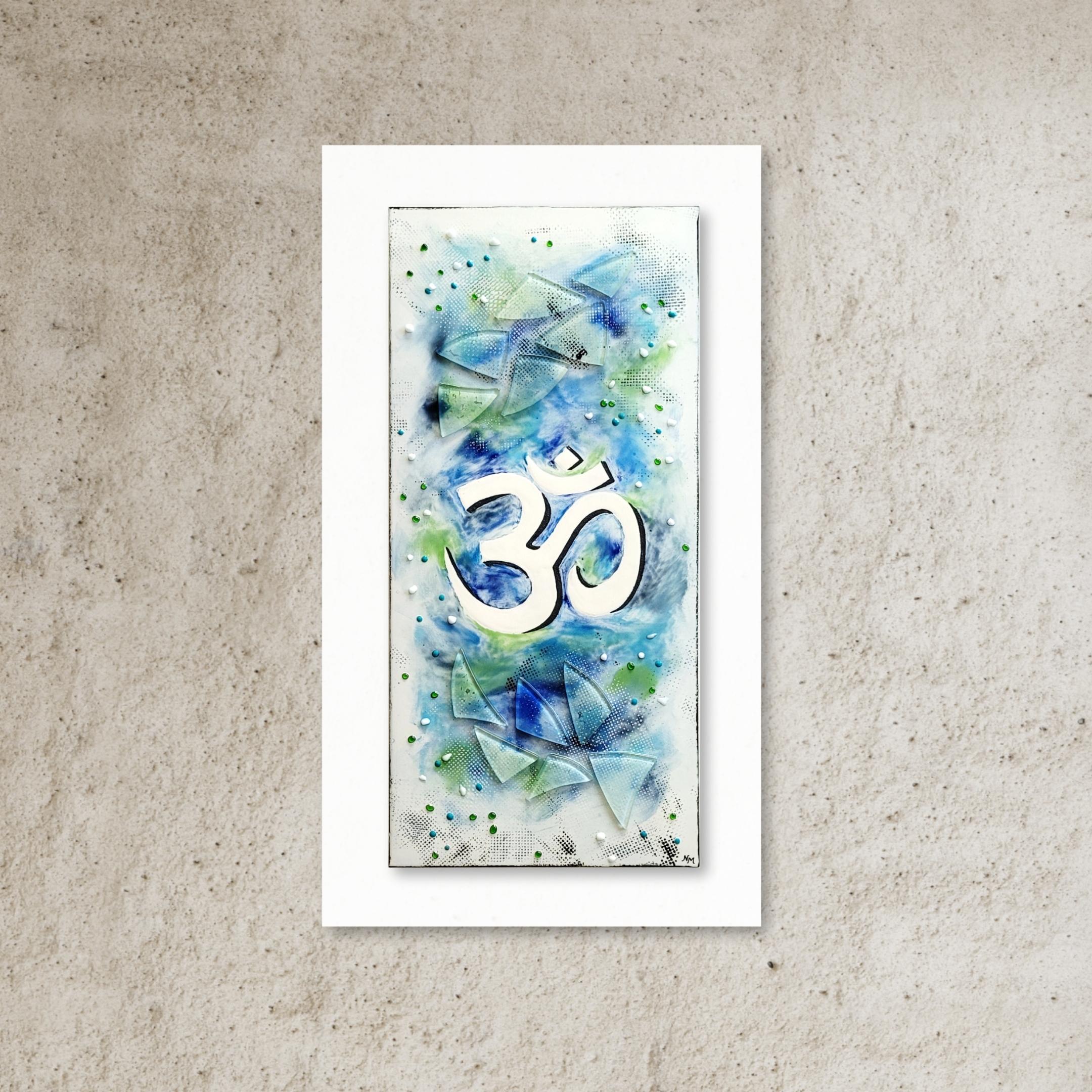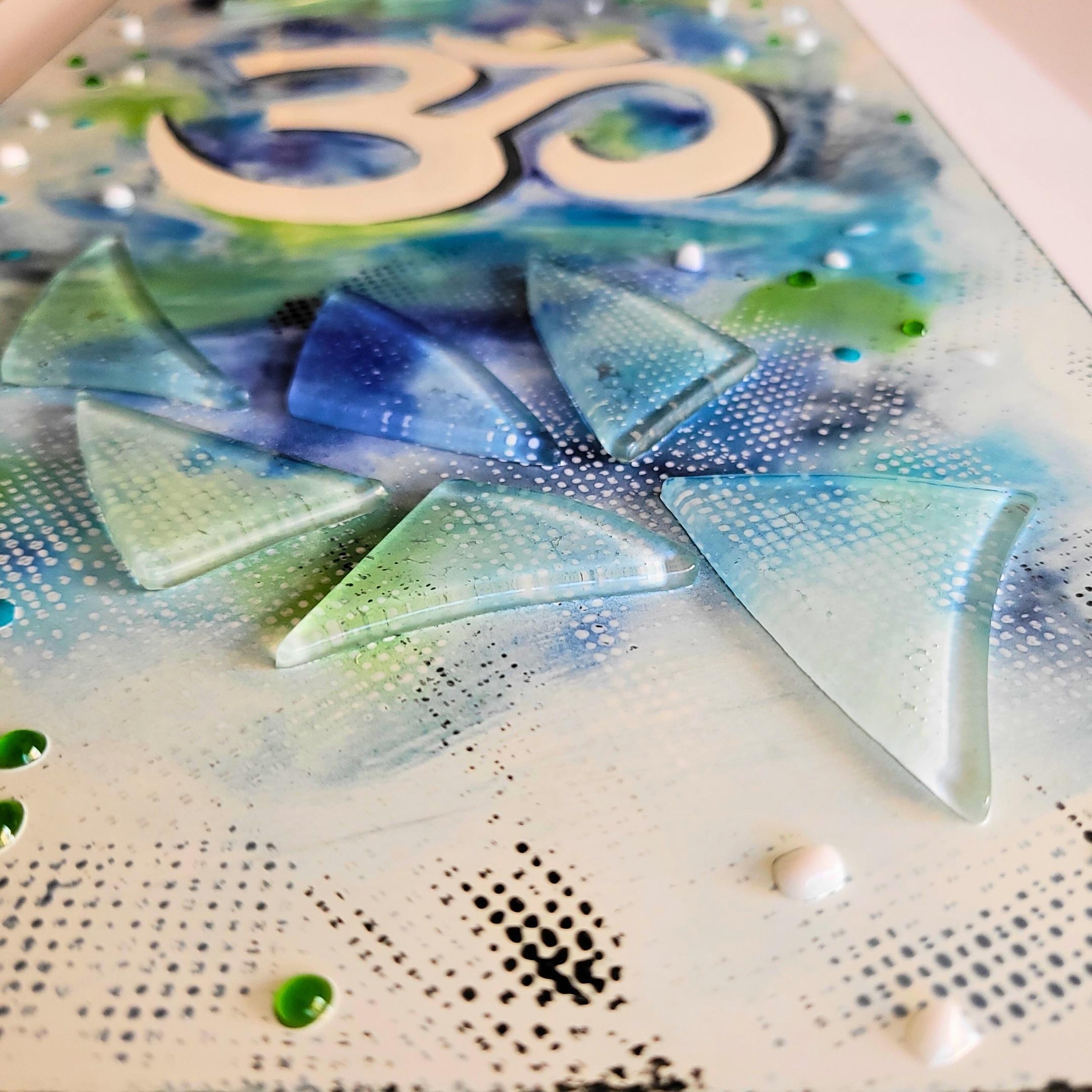 White Aum with a black shadow and a background in shades of blue and green with clear glass textural detail.
