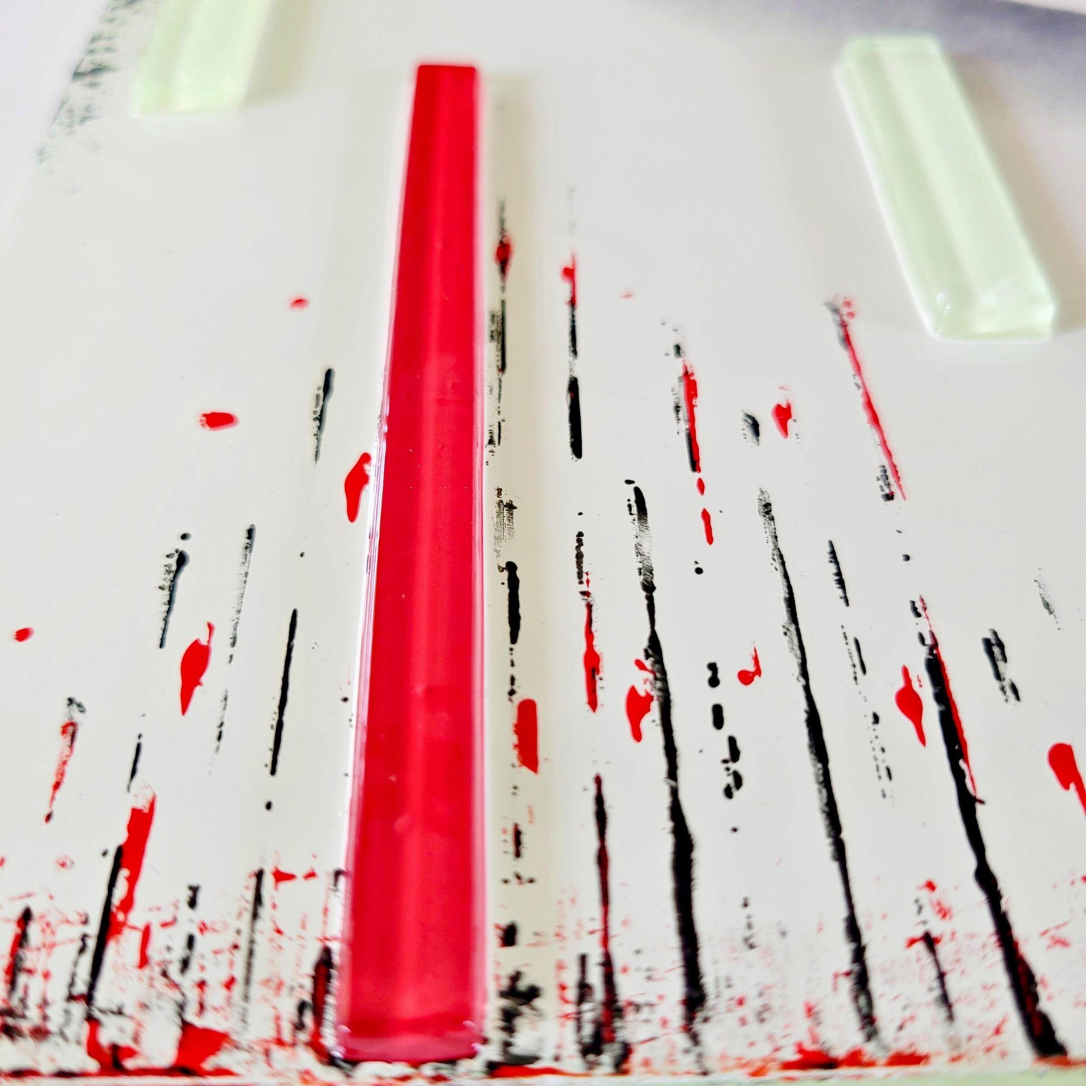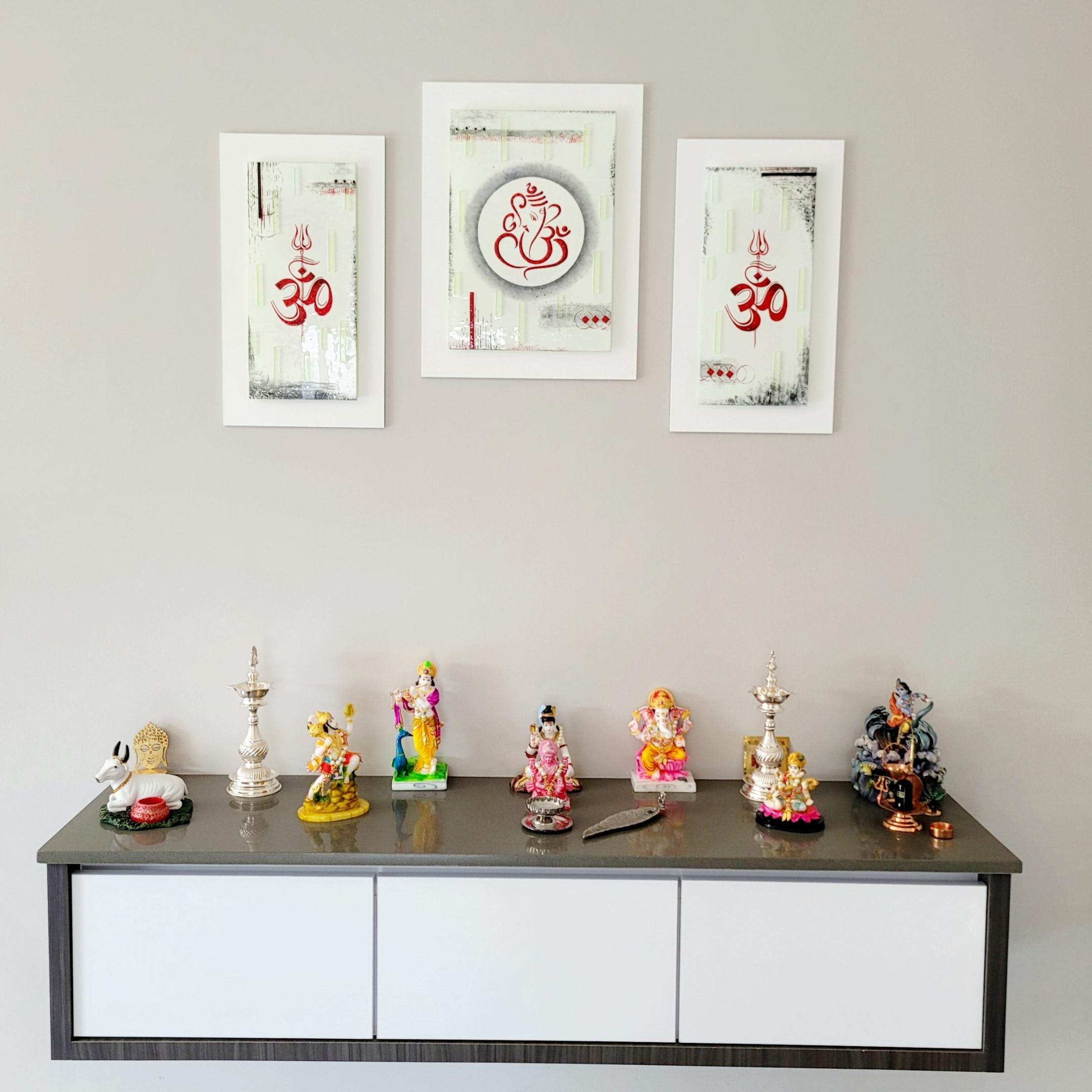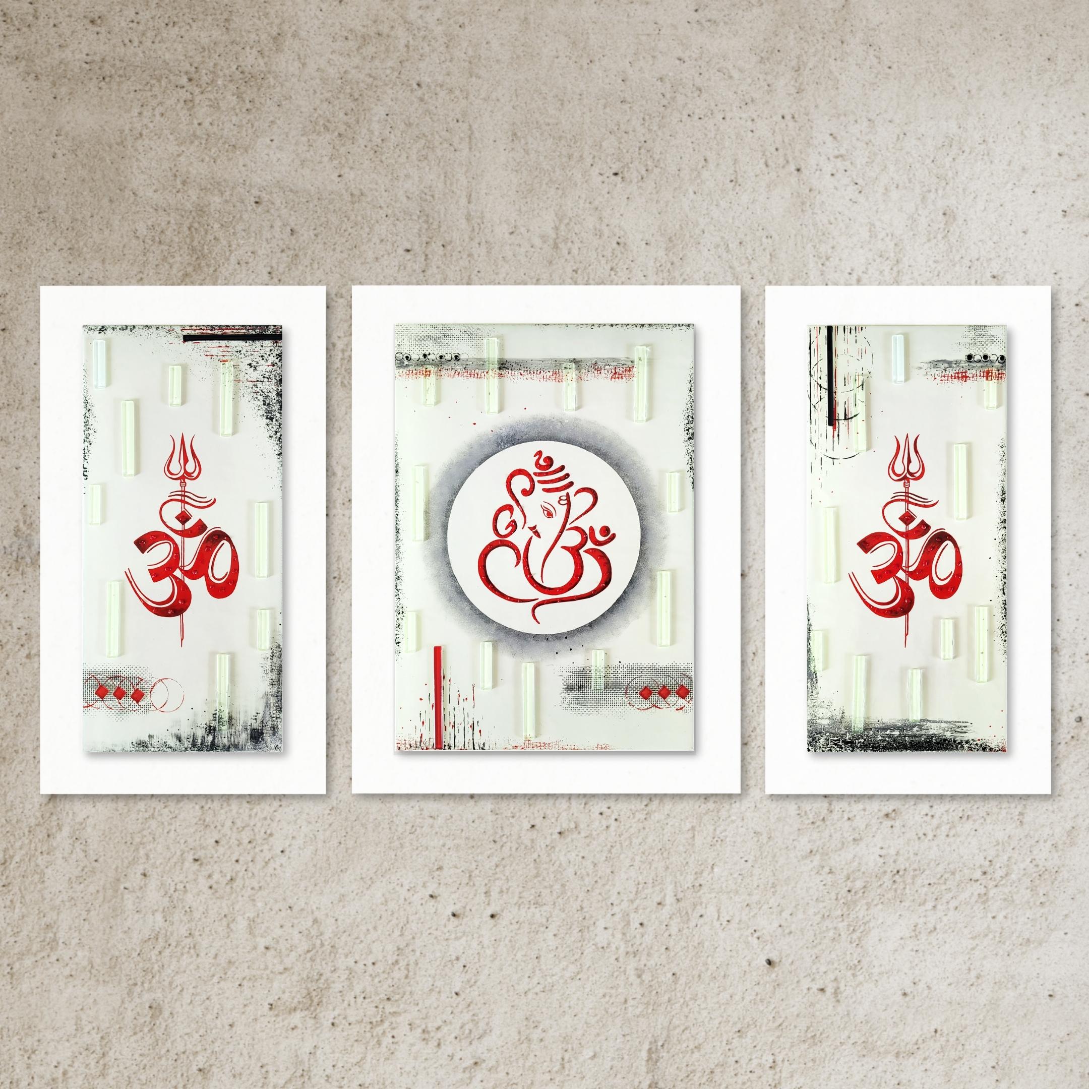 Modern three piece with Aum and Trishul and Ganesh and Aum design. The colours are grey, red, white and black with lots of textural detail.