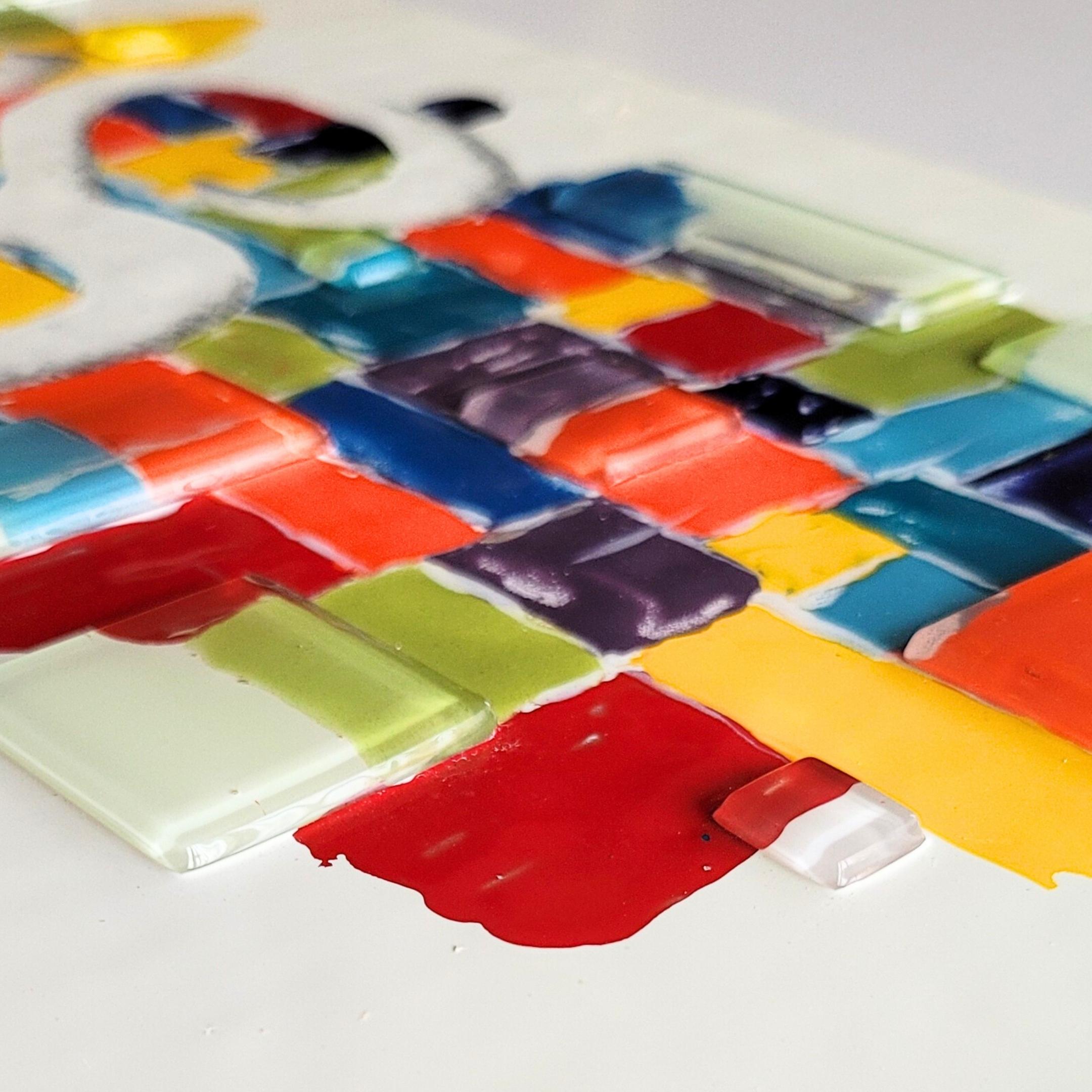 White Aum with a grey shadow. The background is made of multiple colourful squares with clear glass squares for textural detail.