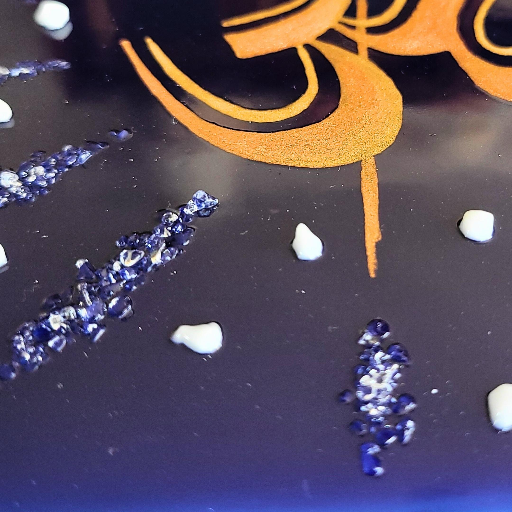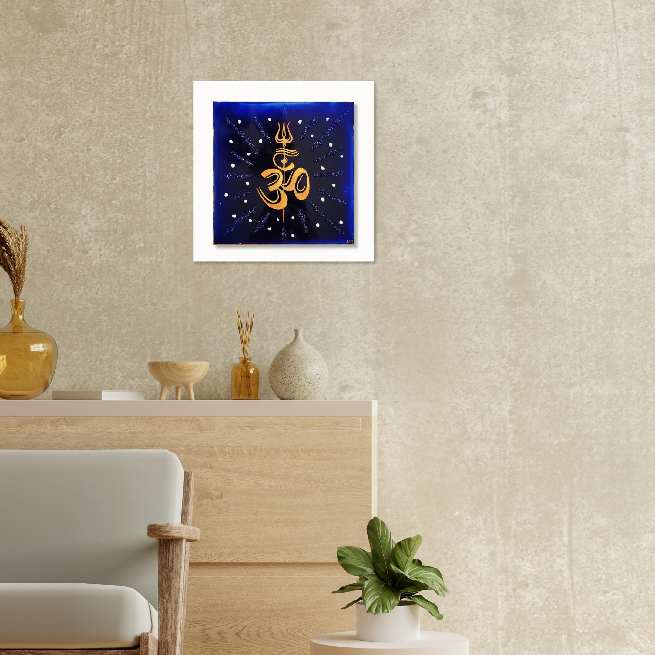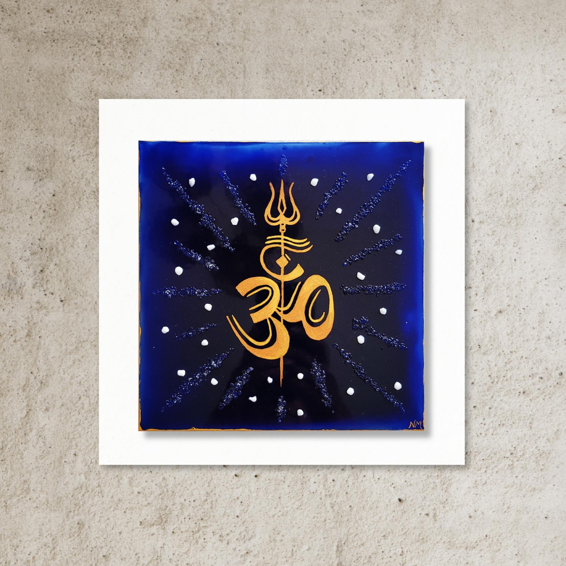 Cobolt blue and gold Aum and Trishul with textural detail in the background.
