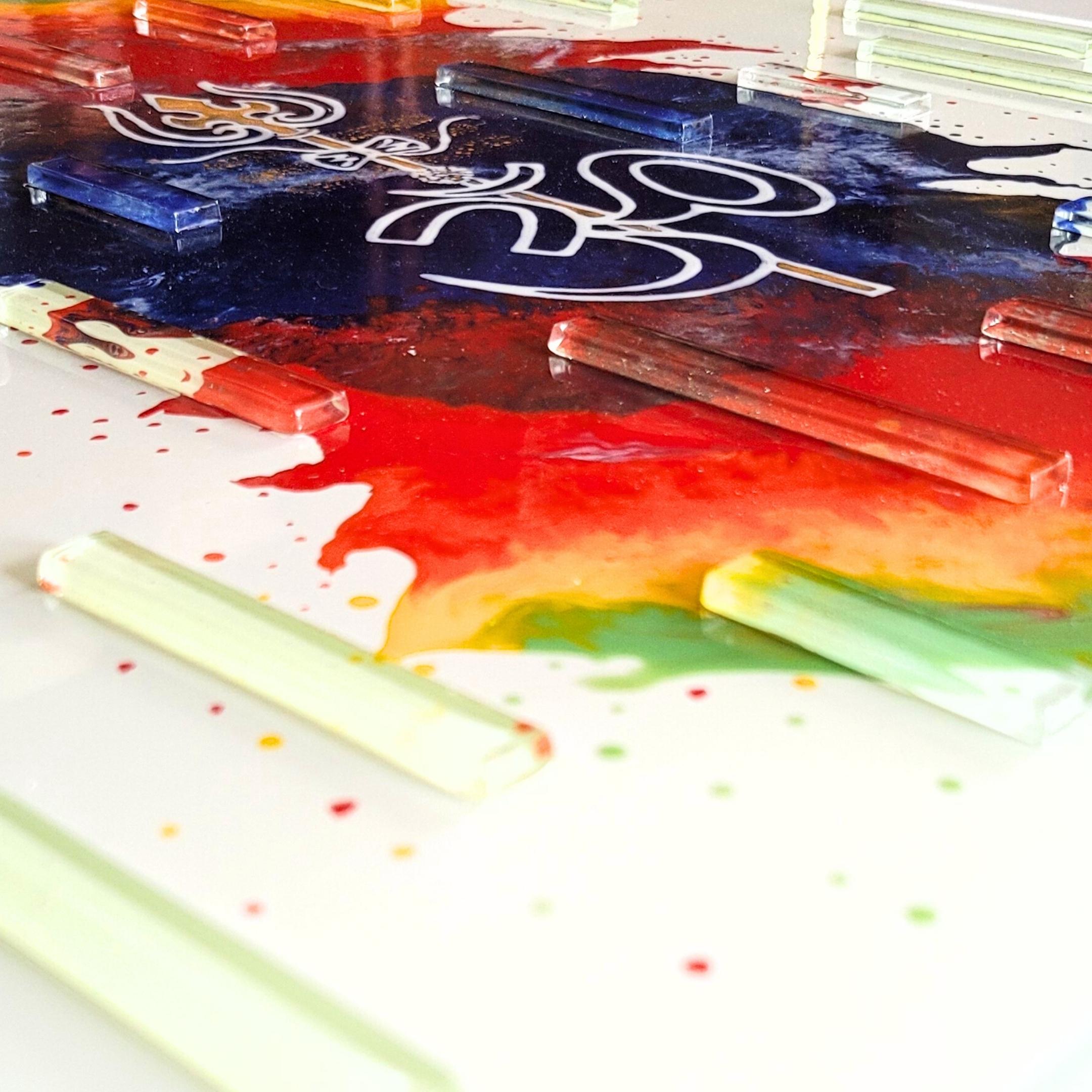 The fluid background is multicolour with clear glass strip detail for texture.