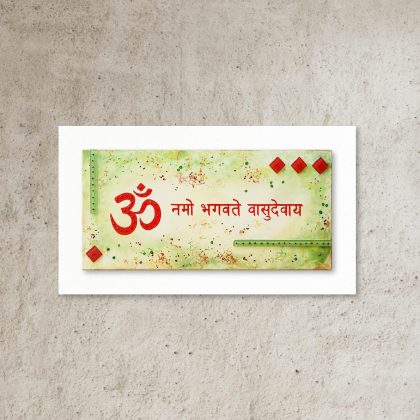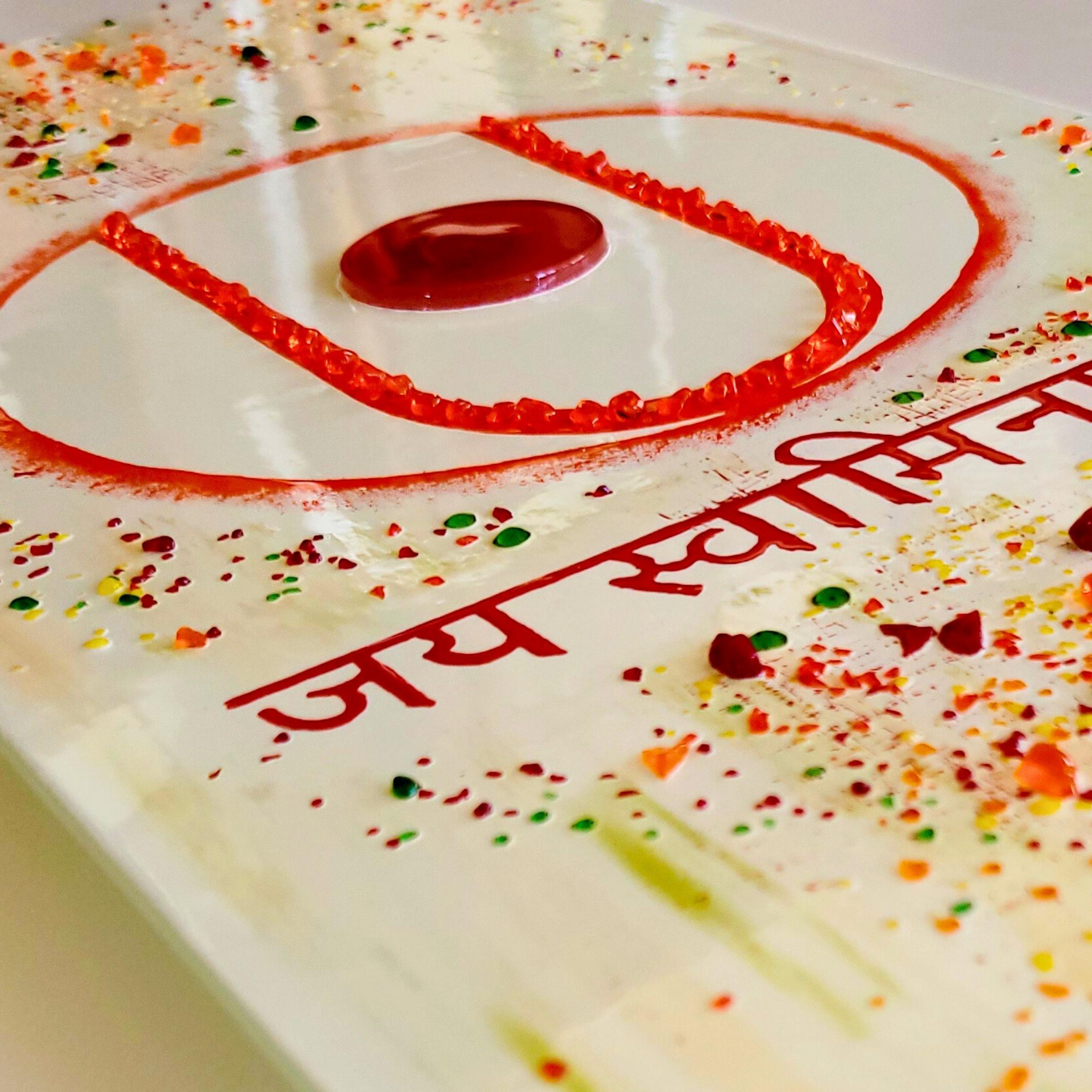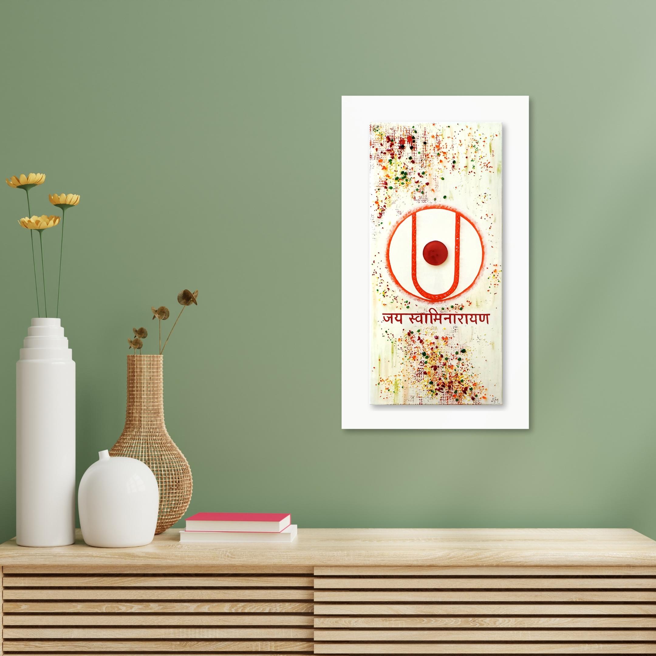 Jai Swaminarayan Tilak in white, red, orange and green with lots of texture.